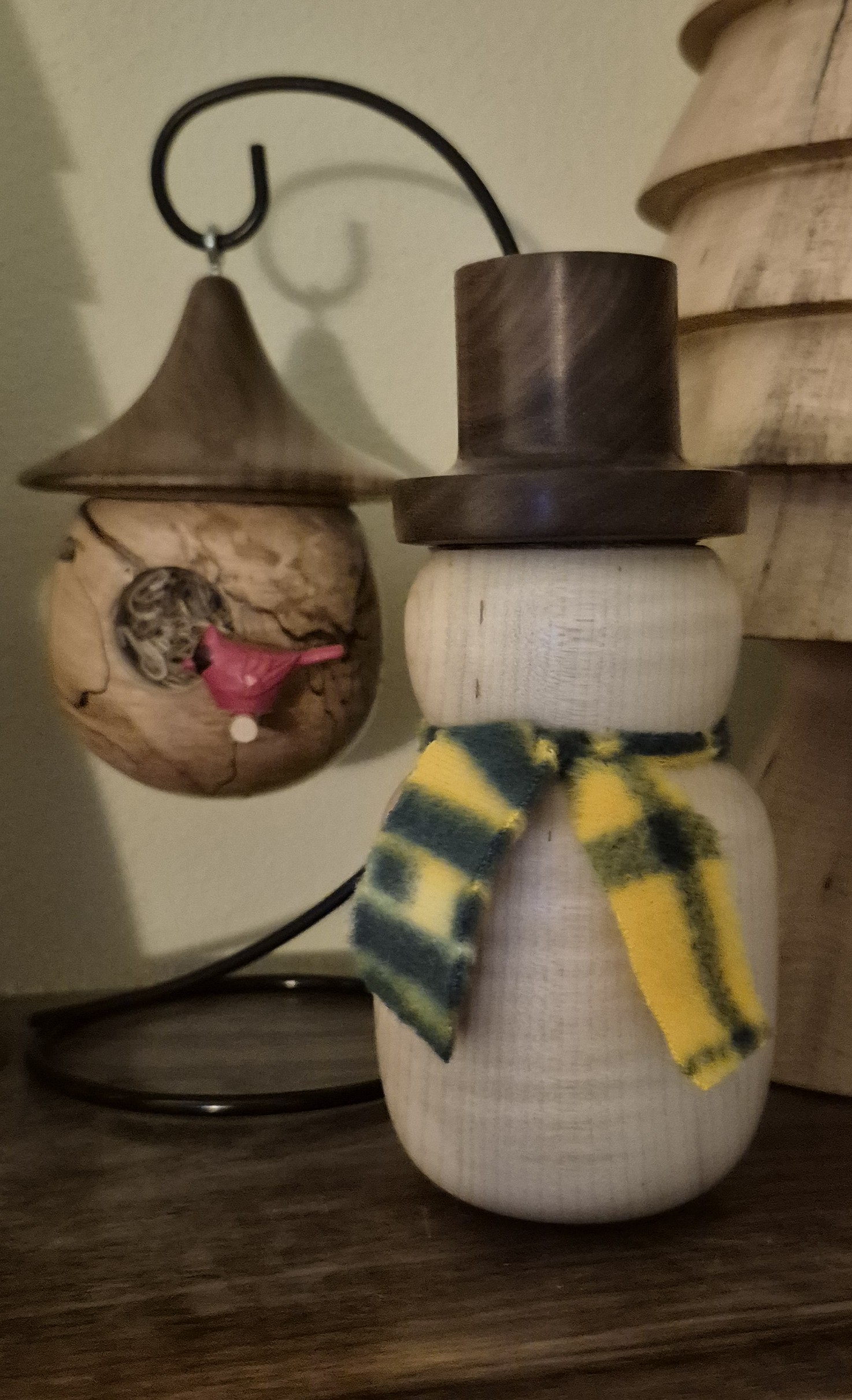 Around the start of Covid, Nick and his dad were doing some house projects. He became familiar with different tools, including a lathe. It started as a hobby. He has continued perfecting his skill because he loves working with wood. He mainly works on the lathe using carbide tip tools. He creates bowls, trees, snowmen, ornaments, and anything else he feels like trying. Nick has also dabbled in epoxy and some tables in the past.